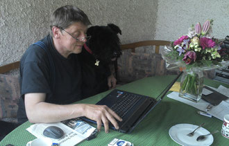 Immer dabei sind seine Hunde, hier die (inzwischen leider verstorbene) Hündin Nelly als Assistentin, die aufpasst, dass der Chef auch alles richtig macht ...